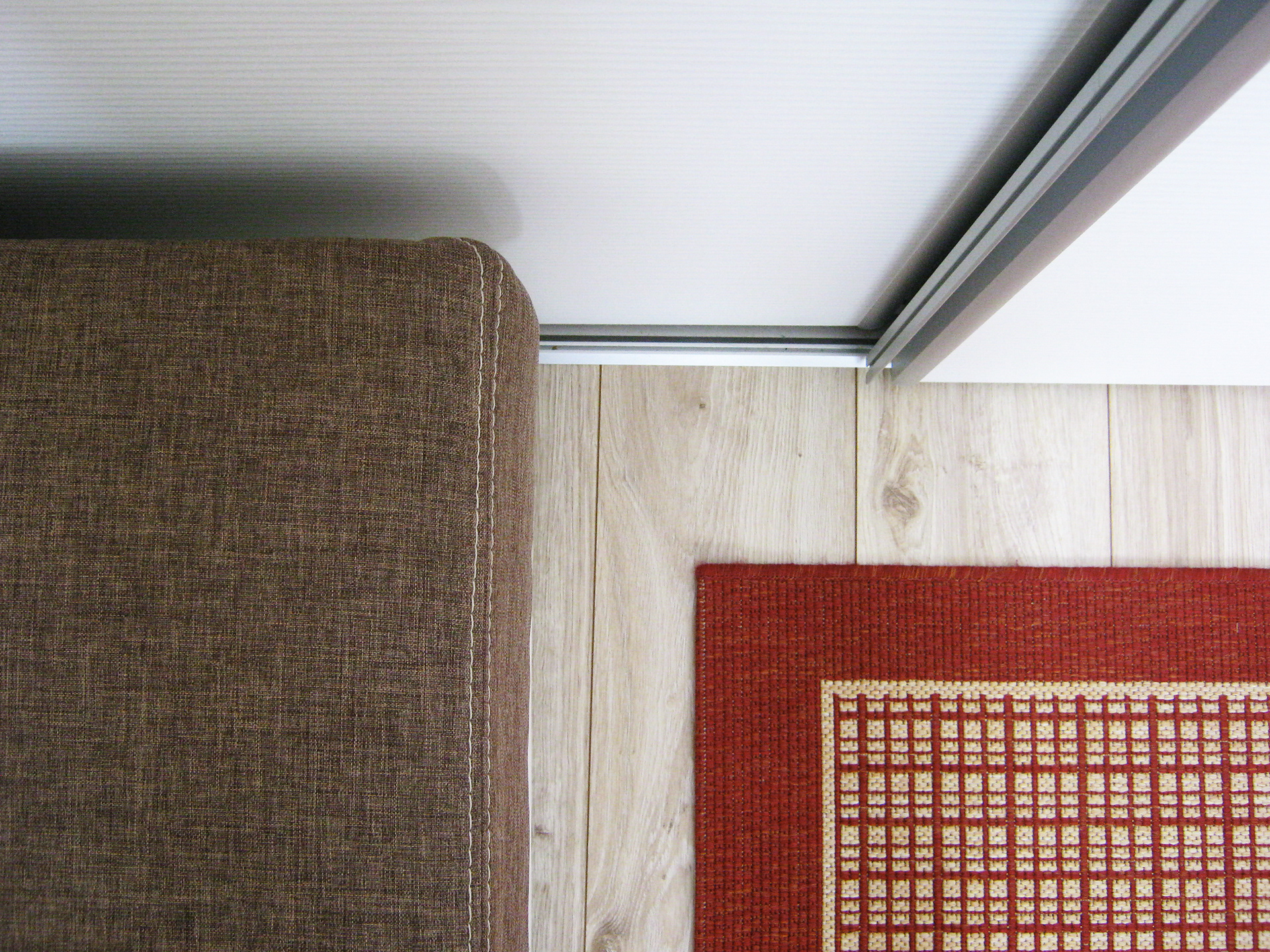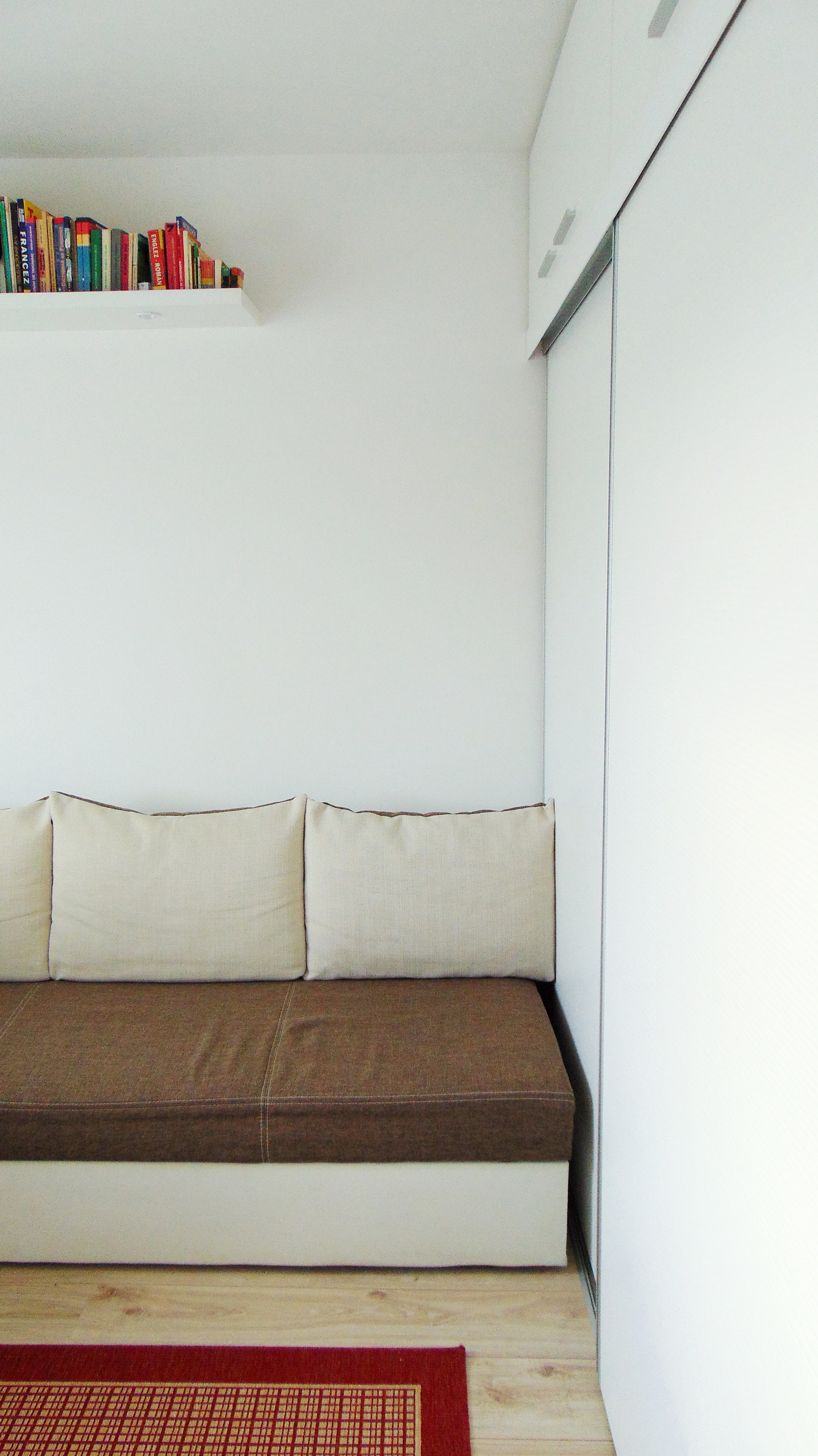 placed on the opposite wall, where the door was moved and integrated with the other two sliding doors, “hiding” in this way the exit. The sleeping area resulted between the two and the bookshelves that connects everything, working in the same time as a sound absorber.