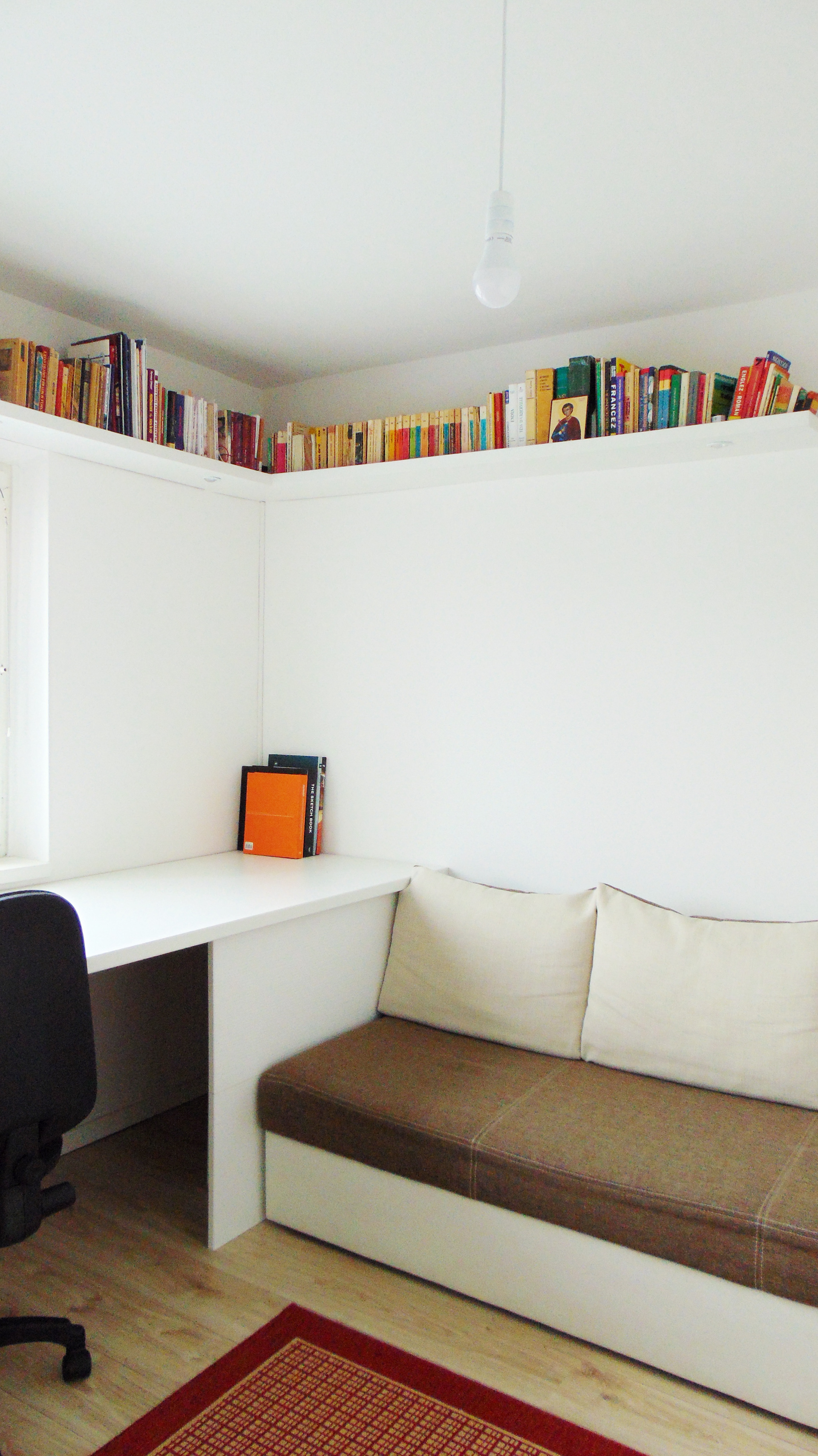 The small area, the three main zones: working, sleeping, storage and the position of the window and door, determined the layout of the room. Thus, the work area was situated in the front of the window, between the walls to serve the necessity of space for drawings, models makings etc. The storage was